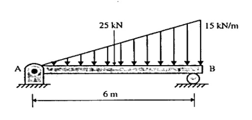 a) Draw the shear force and bending moment diagram for simply supported beam, which carries a uniformly varying load of 15 kN/m and a point load of 25 KN on its center having span of 6m. (Unit 5)