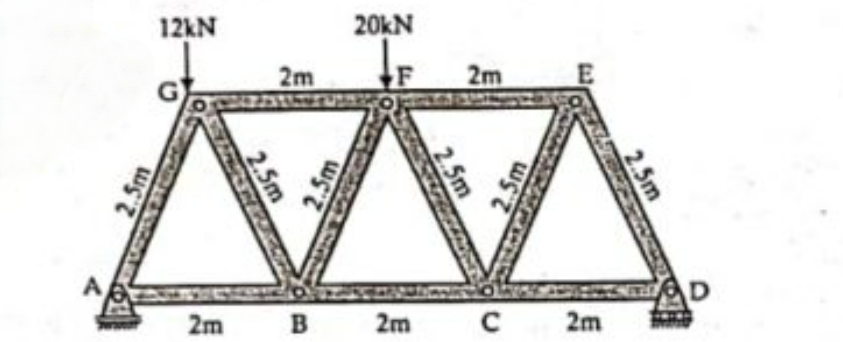 b) Solve the force in all the member using the using method of joint. (Unit 4)